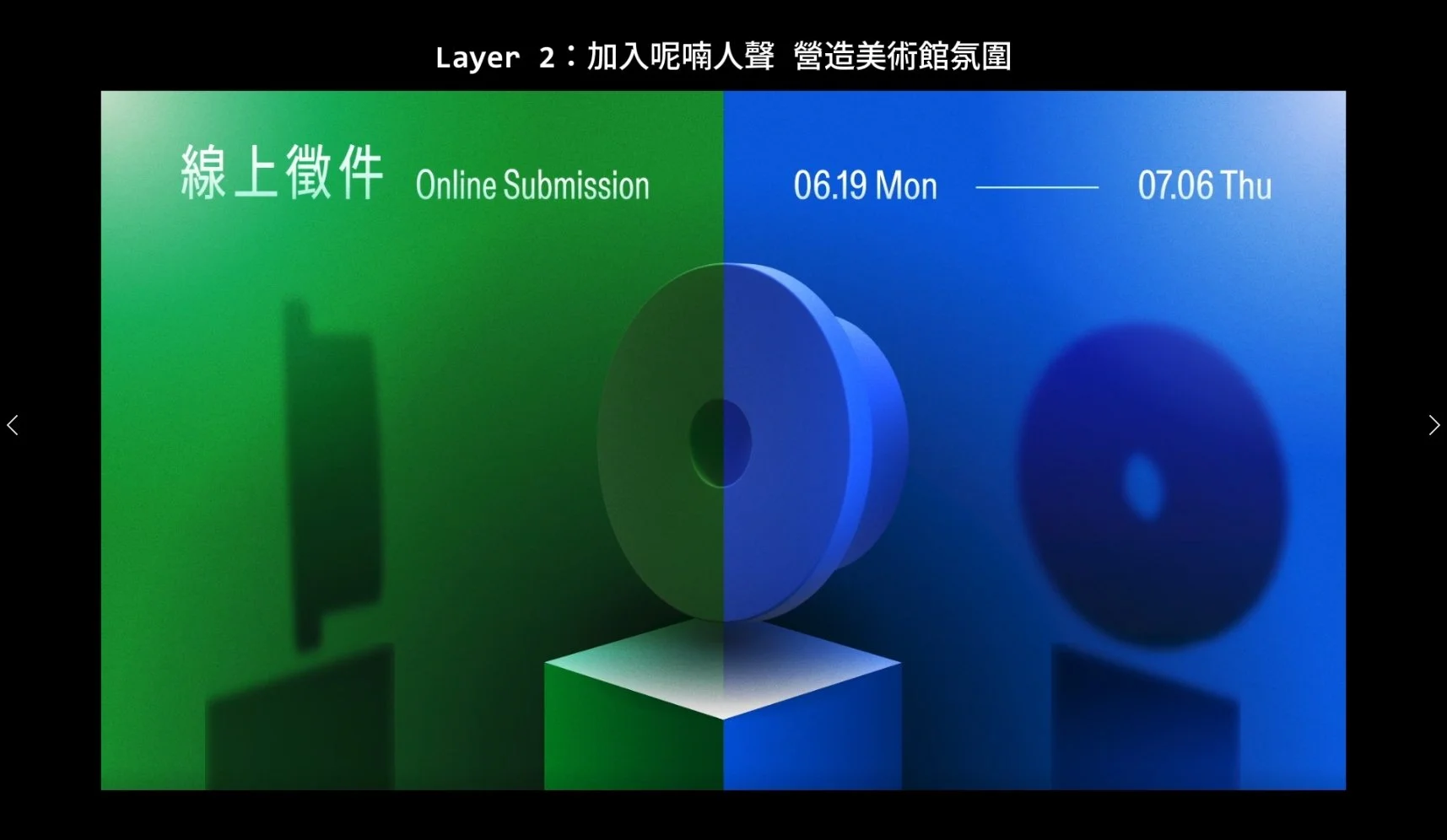 視覺將桃園美術館Logo拆解,藉由不同角度的觀看與形變,帶出立體、新媒體、錄像三元素。這次聲音從「空間感」切入,想像我們身在美術館中觀賞每件展品,偌大空間傳出微微的討論聲,原本平靜的心裡也被藝術品撼動,激起一次又一次的波瀾。